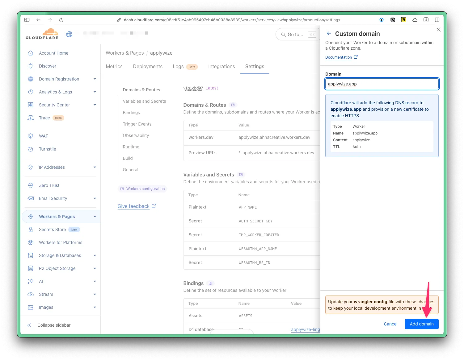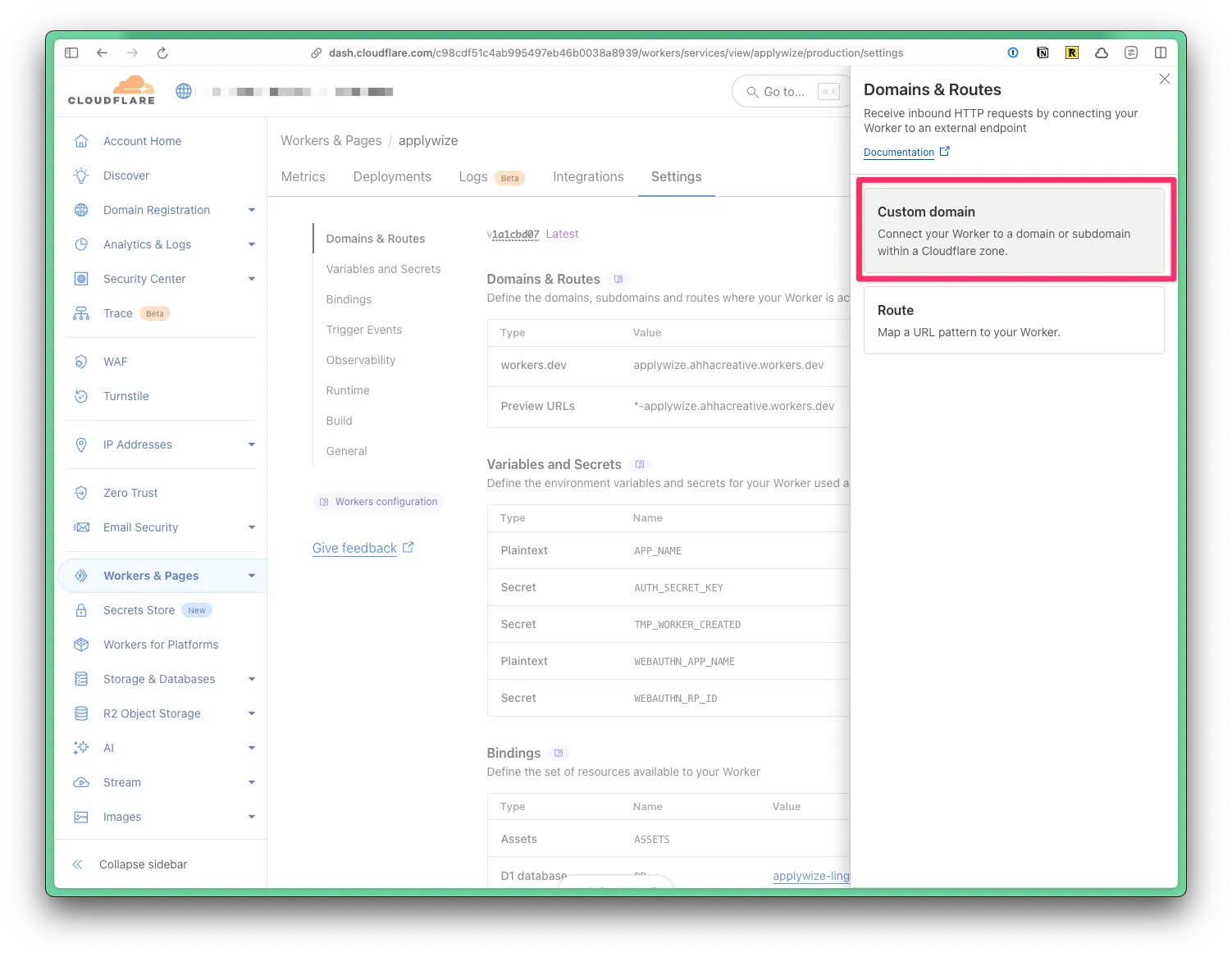 To use a domain name that’s registered to your Cloudflare account, go to Workers & Pages in the left side navigation. Then, click on the name of your project. Click on the Settings tab. At the top, you’ll see the domains associated with your project.