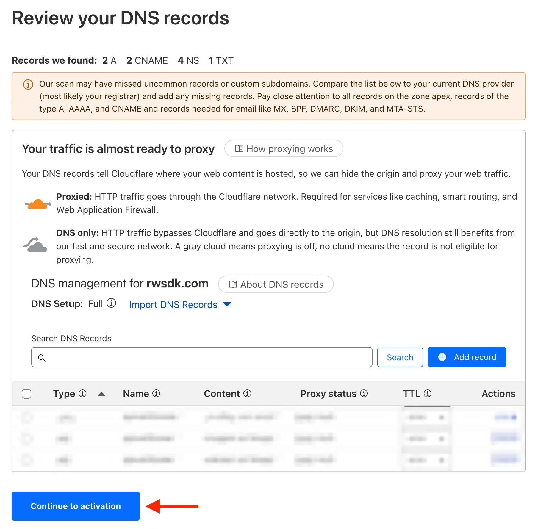 Next, you’ll be asked to review the DNS records that Cloudflare found for your domain. If you have any existing DNS records, they will be automatically imported here. You can add or remove any records as needed, and you can always come back to this later.